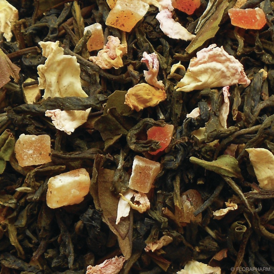 Weißer Tee China Mao Feng, weißer Tee China Pai Mu Tan, kandierte Papayastücke (Papaya, Zucker), natürliches Aroma, Guavestücke(4%), Rosenblütenblätter